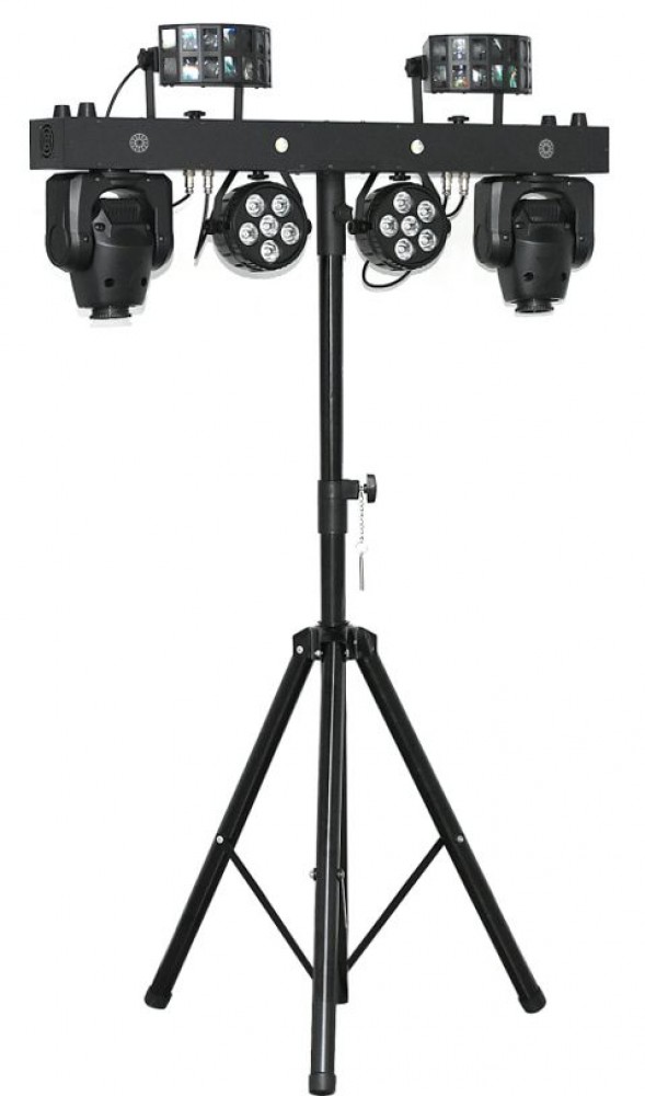 Набор T-BAR MAX — мобильная световая шоу-система для любых праздников, включающая несколько типов приборов (спот, PAR, дерби, стробоскопы) на Т-образной стойке с DMX-управлением.